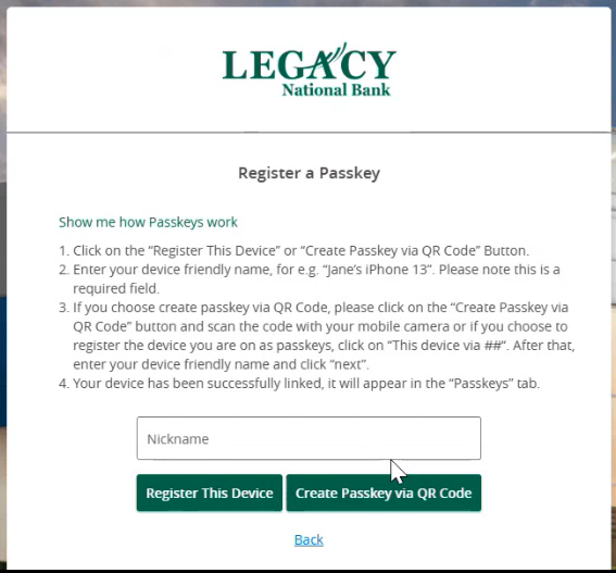 7b. After typing in the name of the device, you will need to select either “Register This Device” or “Create Passkey via QR Code”.