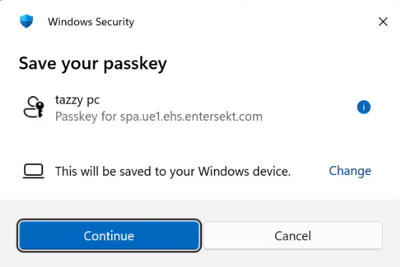 After clicking “Register” there are a few different passkey options that could pop up depending on your computer configuration. The below example prompts you to “Save your passkey”. This box will represent the name you gave your computer (in this example: Sarah Laptop).