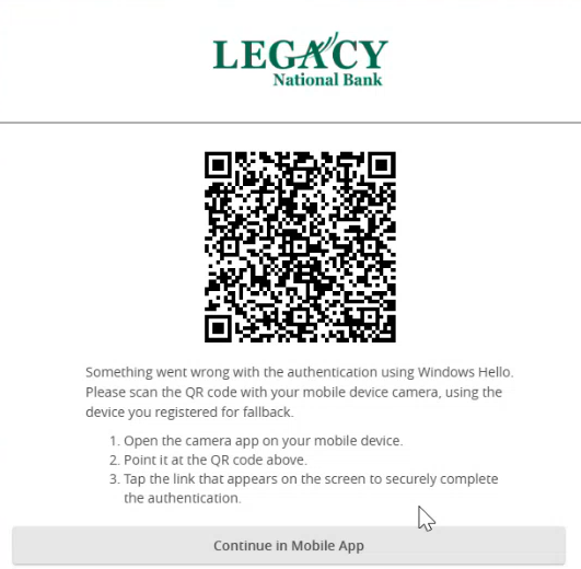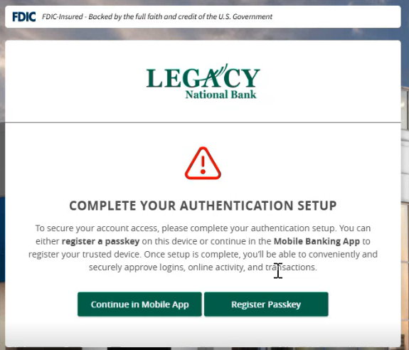 6. After clicking “Continue” you will have two options: “Continue in Mobile App” or “Register Passkey”.