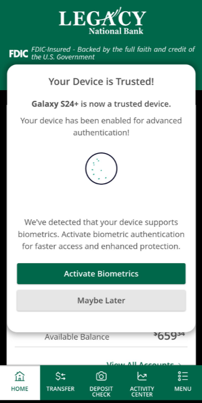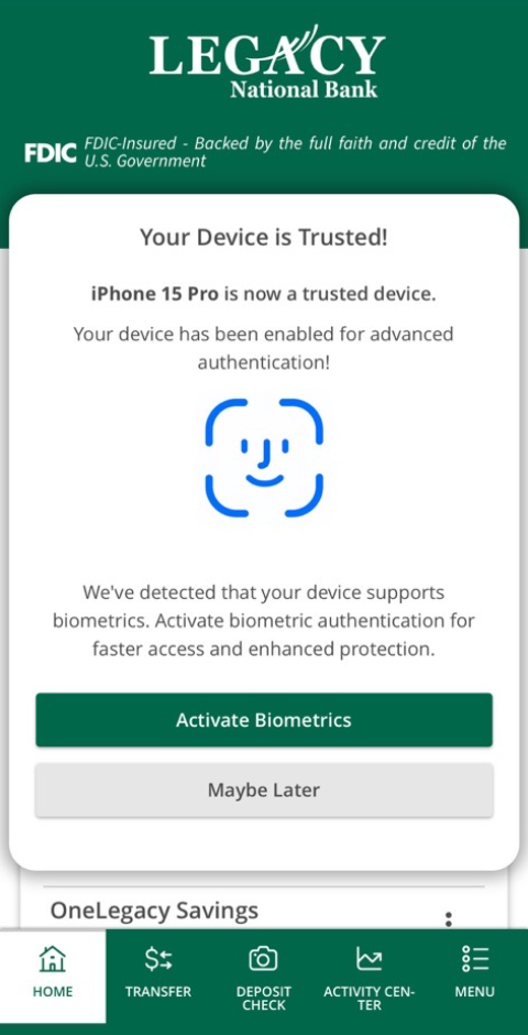 8. Choose whether to activate your Biometrics now or later. Below are screenshots from both an Android and an iPhone