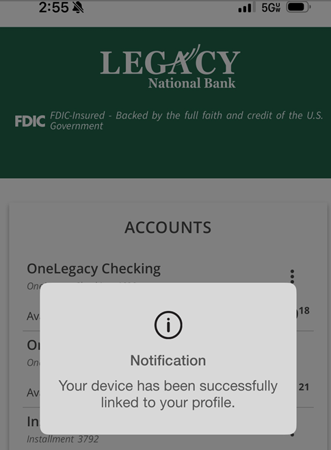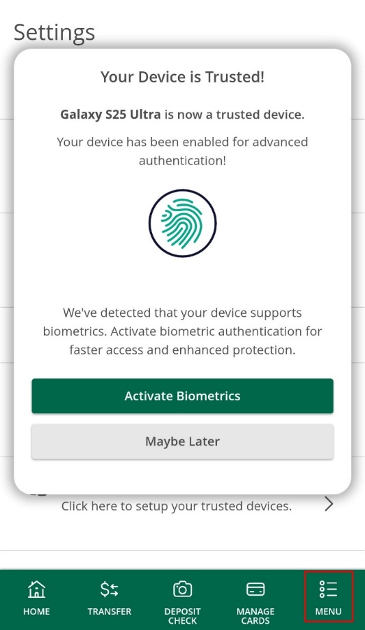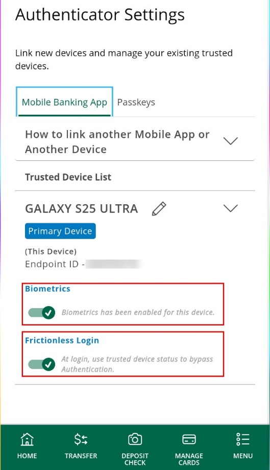12. In addition to setting up biometrics, it is also recommended to enable “Frictionless Login”. Once you select Frictionless Login, you should receive a notification letting you know your device has been successfully linked to your profile.
