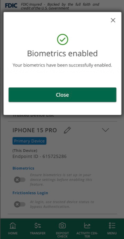 11. Once you have completed enabling your biometrics, you will receive the below message. Click “Close”.